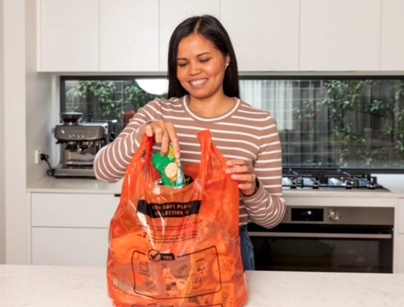 Soft plastics can only be recycled in the supplied orange bags and should be empty and dry. The orange collection bags are made in Australia from 100% recycled plastic.
